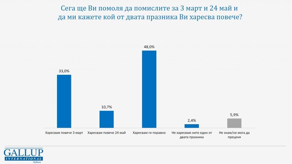 Въпросът за националния празник също беше експериментално проверен. Добре би било по темата да се чуят различните мотиви и други изследователски институти да покажат своите трактовки по темата, включително извън летния сезон. Но на първо четене не се вижда сериозна степен на противоречие в масовото съзнание между 3 март и двадесет и 24 май, а самата промяна на националния празник не среща почти никаква подкрепа, отбелязват от "Галъп".